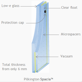 – Spacia™ vacuum glazing consists of an outer frame of low-emissivity glass and an inner frame of clear float glass. Air is extracted to create a vacuum, rather than being filled with inert gas.